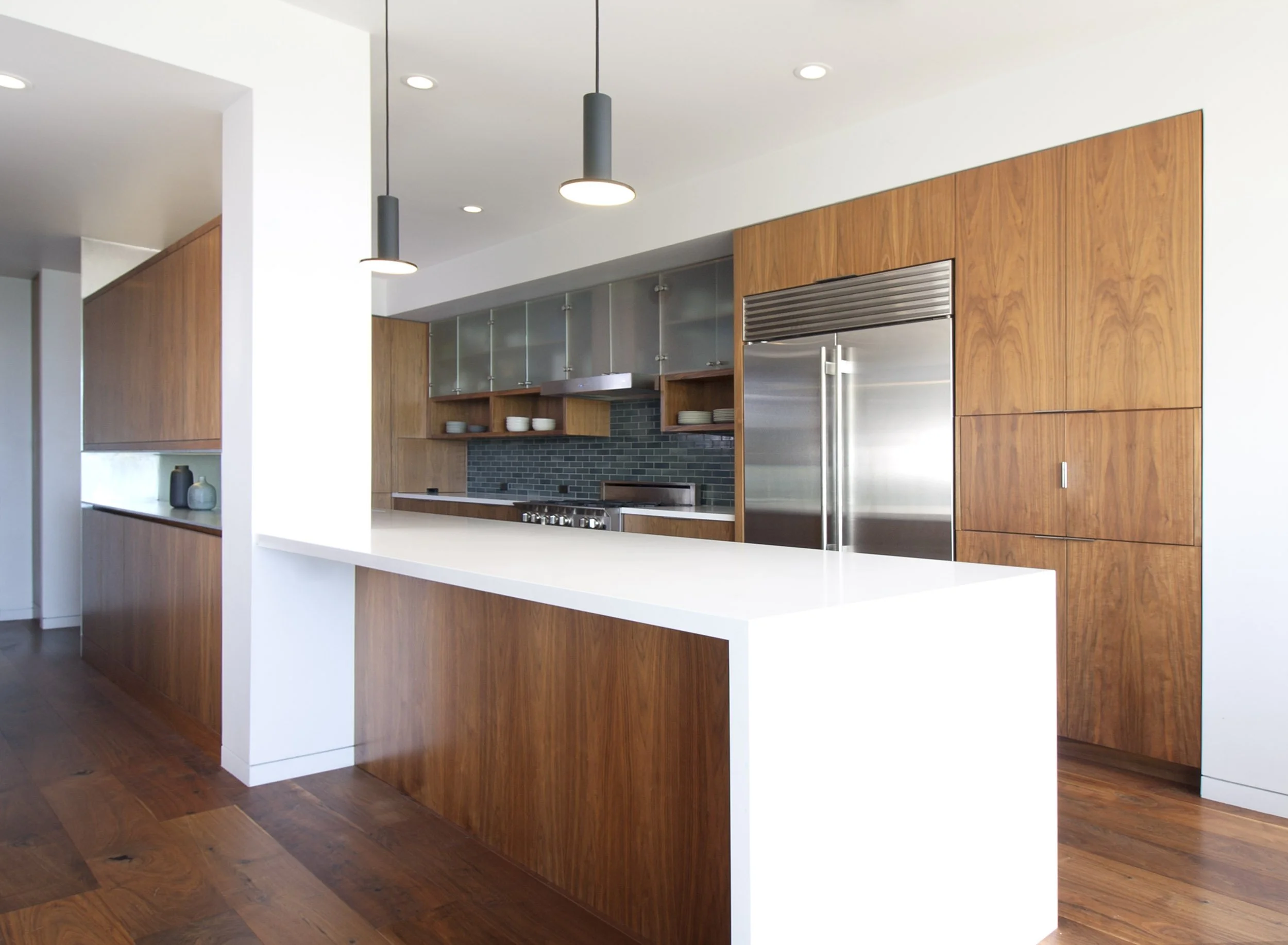 The warmth of walnut, used in the casework, floors, and stair screen, provides a unifying element throughout helping to create a comfortable home for three generations of family.