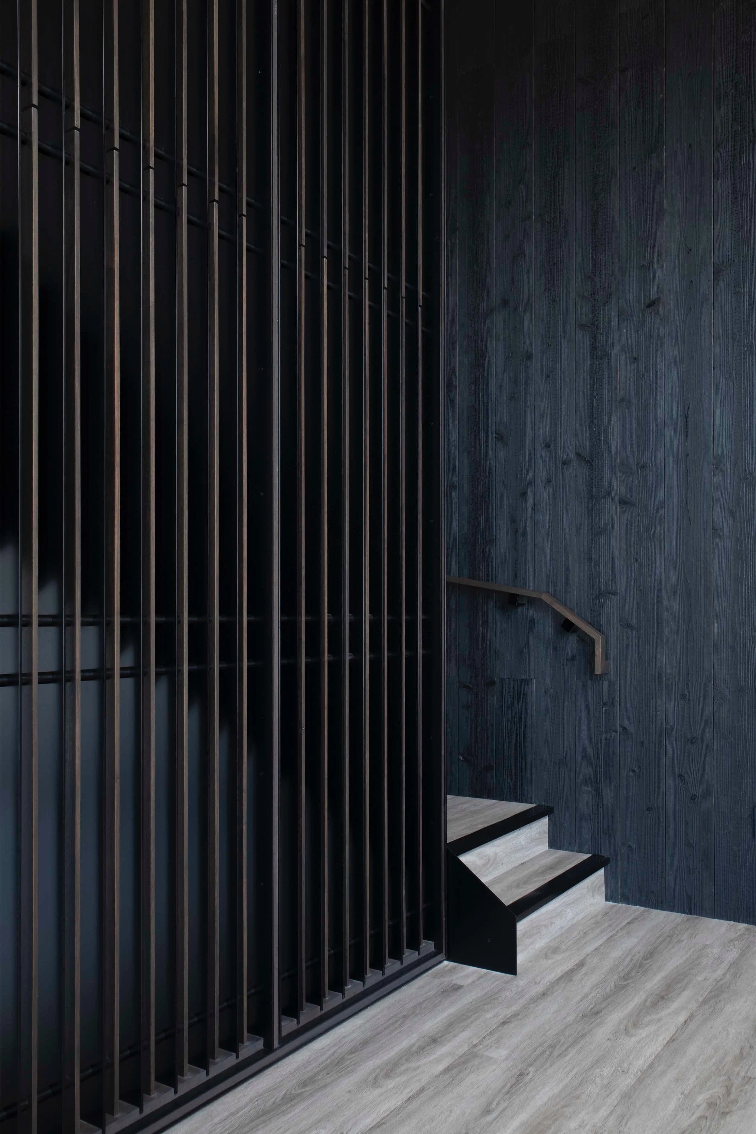 The design is grounded in a palette of textured restraint: charred Shou Sugi Ban cladding, powder-coated metalwork, stained walnut, and tailored leather elements form a moody, immersive envelope. Within this framework, functional zones are visually and spatially interwoven, their boundaries softened to support fluid movement and layered activities.
